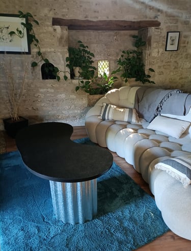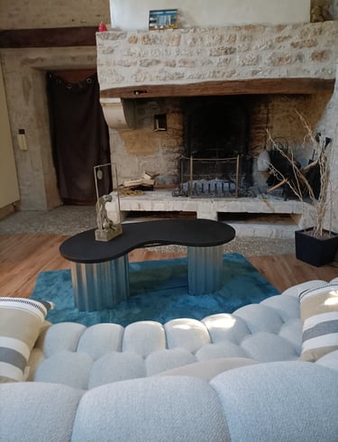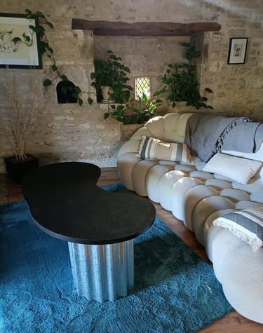 Une table basse imaginée et dessinée d'un particulier qui souhaitait des lignes organiques ainsi qu'un contraste de matières. La base en métal ondulé apporte une touche industrielle, tandis que le plateau joue la carte du contemporain. Un design pensé pour dialoguer avec les volumes généreux du salon.